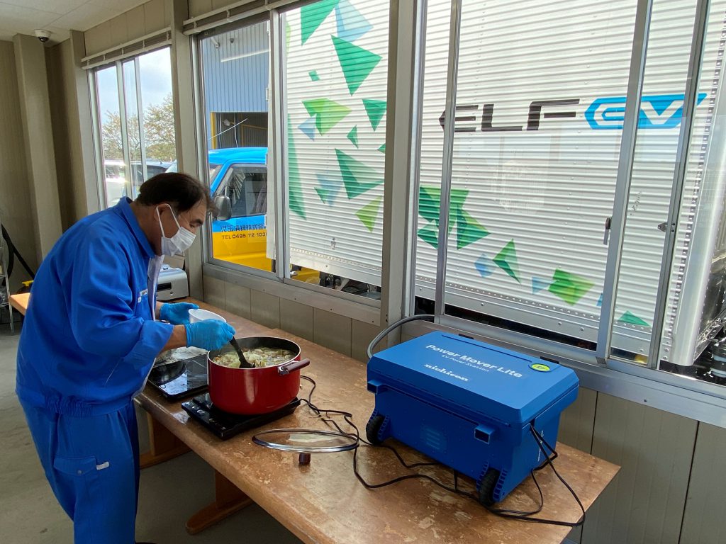 災害訓練の一環として、今回もELFのEV車をお借りし、V2Lに繋げてクッキングスタートです!