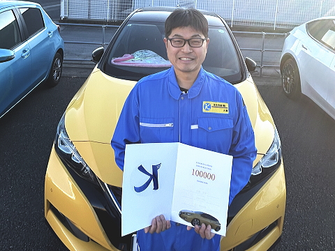 この度、この支援制度を活用して社員が購入したEVが、走行100,000キロを達成、丁寧な整備と環境にやさしい通勤をしていることについて社内表彰をいたしました。社員には表彰状と記念のファイルや愛車のキーフォルダなどオリジナルグッズを贈呈し、今後も安全運転で長く大切に乗っていいただくよう伝えました。