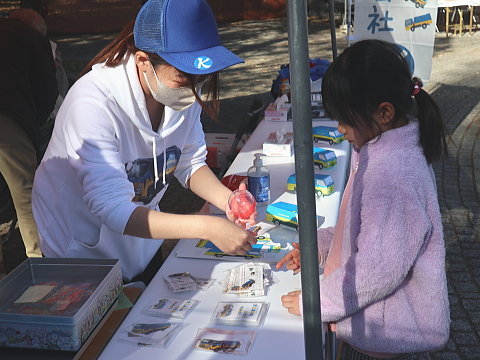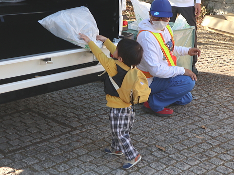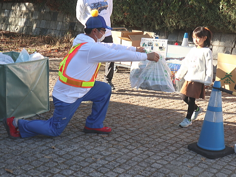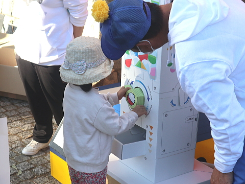 当日は、ISUZUさまのご協力と弊社社員で、小学生以下のお子さまを対象にした「EVパッカー車への試乗体験」「EVパッカー車へのごみの積込み体験」を行い、300名を超える皆さまに参加いただきました。「試乗体験」のお子さまにはISUZUさまよりボールペンなどがプレゼントされ、「積込み体験」に参加していただいたお子さまには、弊社の手作りオリジナルグッズが当たる「ガチャガチャ」参加券をお渡ししました。