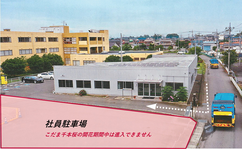 これから桜の盛りを迎え、弊社周辺が混雑いたしますので、安全確保の観点から当分の間「社員駐車場(写真参照)」への車両の進入をとりやめます。